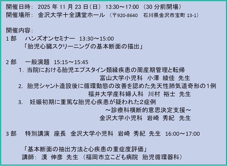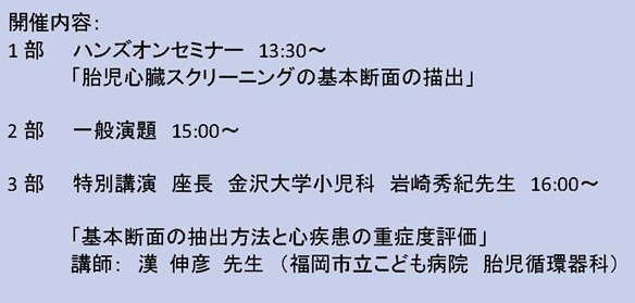 実際のエコー操作を学んでいただきます。 会場では、実施に妊婦さんにご協力頂き、胎児心エコーの基本断面の描出にチャレンジして頂きます。エコー画像はリアルタイムで会場およびWebで供覧していきます。 最新のGE社Volson機種を使用します。 初心者向けのハンズオンセミナーとなっていますので、振るってご参加ください。